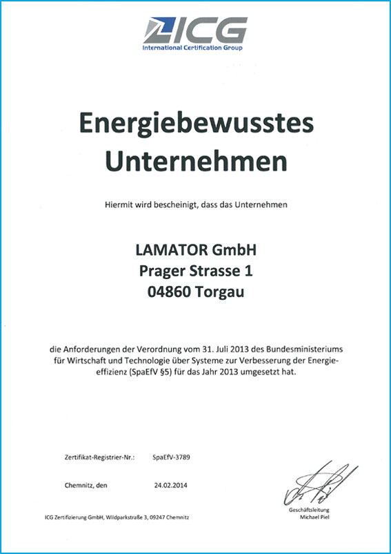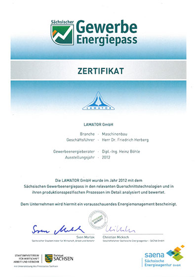 The LAMATOR GmbH is certified in March of 2013 with the Saxon Gewerbeenergiepass (SäGEP).